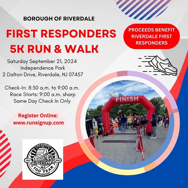 Posted August 19, 2024The Borough of Riverdale has announced the Riverdale First Responders 5K Run and Walk on Saturday September 21, 2024 at 9:00 a.m. at Independence Park, 2 Dalton Drive, Riverdale, N.J. 07457.