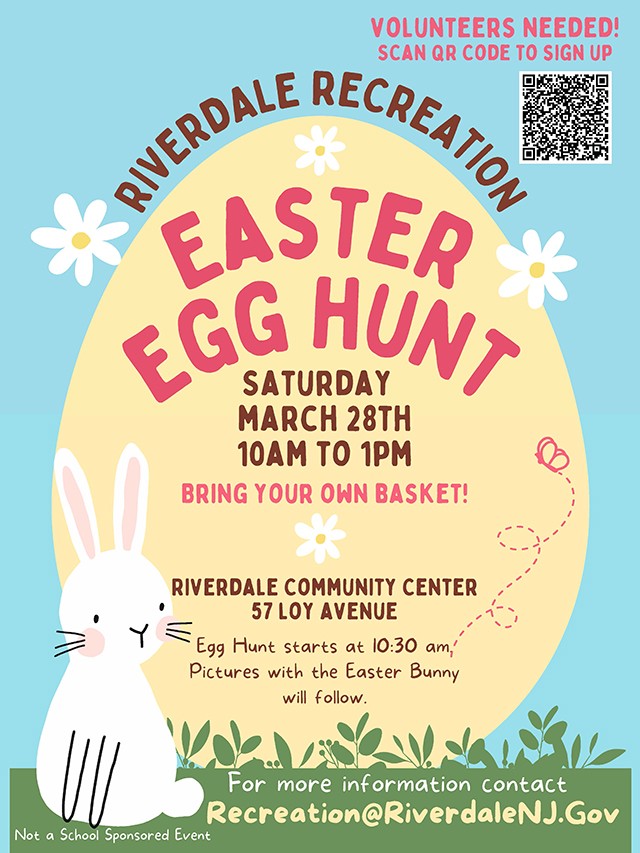 Posted March 17, 2026Join us for the Recreation Easter Egg Hunt on Saturday, March 28, 2026 at the Riverdale Community Center, 57 Loy Ave., from 10 a.m. to 1 p.m. Egg Hunt starts at 10:30 a.m.; must bring your own basket. Pictures with the Easter Bunny will follow.