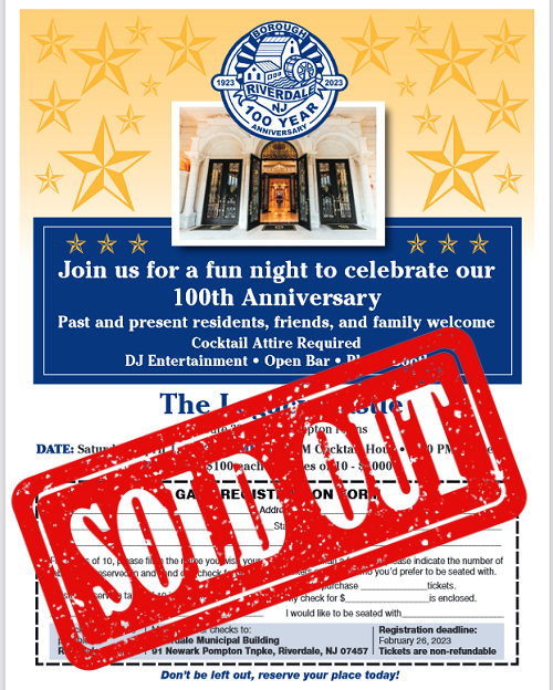 Join the Borough of Riverdale as we celebrate our historic 100th Anniversary with a Centennial Gala on Saturday April 1, 2023 at the Legacy Castle, 141 NJ-23 South, Pompton Plains, N.J. 07444. Join us for a fun night to celebrate with past and present Riverdale residents, friends, and family. All are welcome.